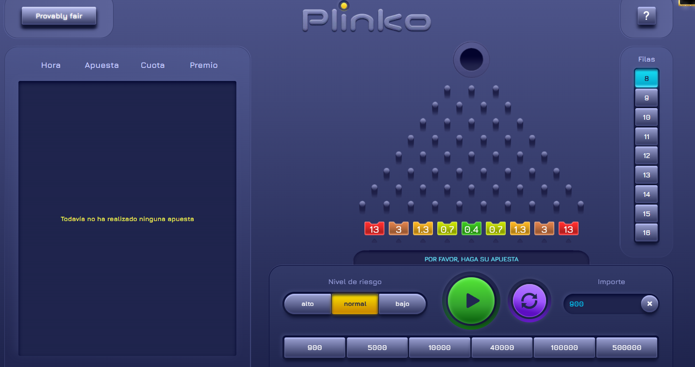 El Plinko es de esos juegos que uno prueba una vez y ya queda pegado. Está inspirado en un concurso de televisión bien famoso, pero aquí en el casino online la cosa es todavía más entretenida. La dinámica es sencillita: tiras una bolita desde arriba de una especie de pirámide llena de clavitos, y mientras va bajando empieza a rebotar toda loca hasta caer en uno de los multiplicadores de abajo.